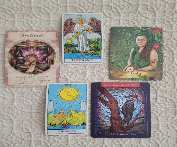 CARD #3 – Pileated Woodpecker (Maia Toll’s The Illustrated Bestiary Oracle Cards) – This is a card representing passion and fire. Have you forgotten your deepest dreams, desires, and joys? Overthinking and staying in our critical minds can keep us apart from the simple heartfelt joys that energize us. You may not know the woodpecker has an extra-long tongue that he wraps around his brain to protect it from the ongoing hammering he produces each day. There is rhythm and pattern in his drumming which invites you to get into the primal rhythm of the pulse of life again. Free yourself and feel your inner fire.